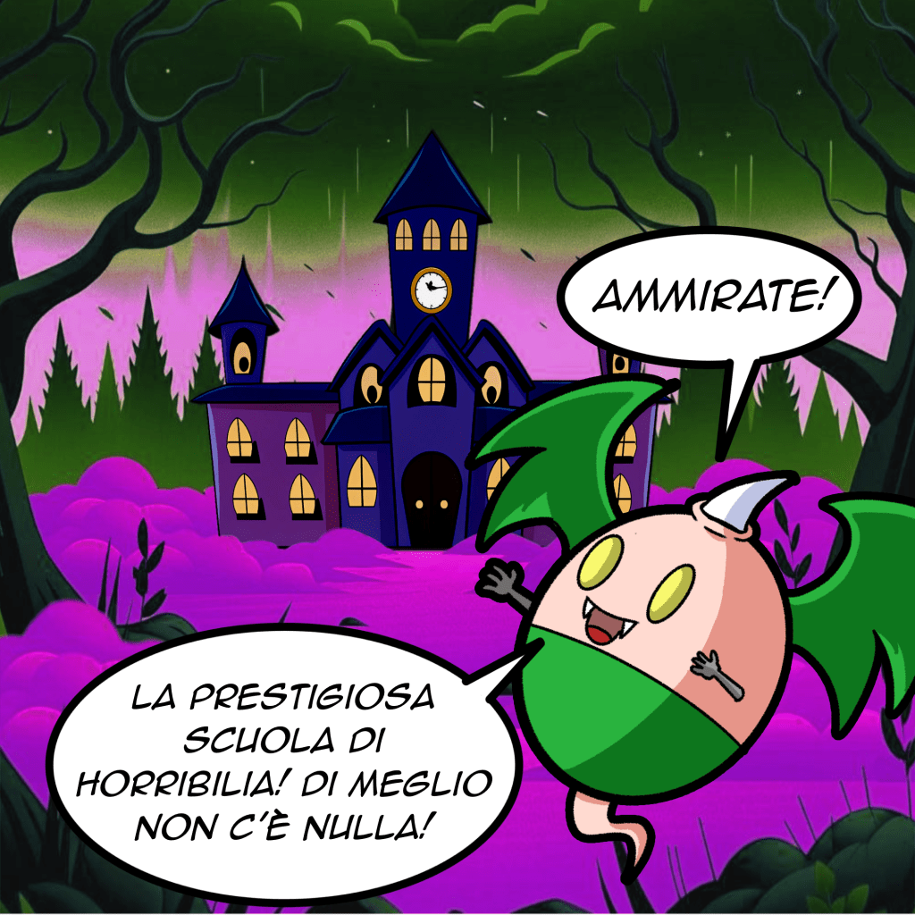 Ed eccoci qui, arrivati alla strabiliante, paurosa, inquietante, orripilante, marciscente… scuola di Horribilia!!! Suoniamo all’ orcoportone ed entriamo!